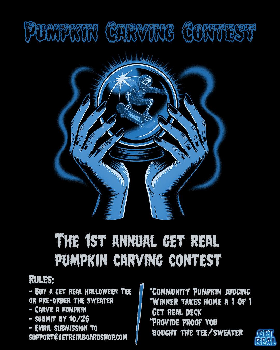 The 1st Annual Get Real Halloween Pumpkin Carving Contest! To enter the contest purchase this shirt and submit a pumpkin by 10/26. Good Luck!